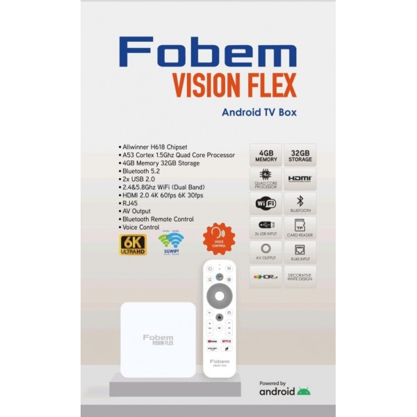 Android TV Box 6K UHD 4GB RAM 32GB ROM Wi-Fi Bluetooth Vision Flex Fobem