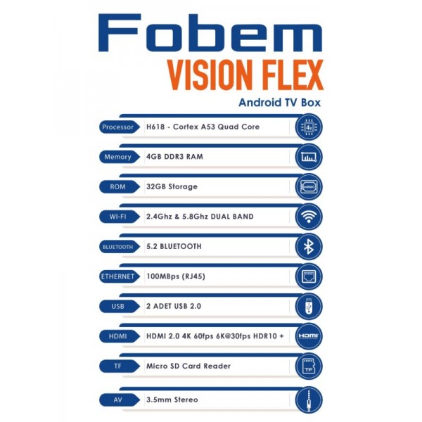 Το Vision Flex της Fobem είναι ένα αξιόπιστο Android TV Box σχεδιασμένο για αναπαραγωγή πολυμέσων σε υψηλή ανάλυση έως 6K Ultra HD. Εξοπλίζεται με τετραπύρηνο επεξεργαστή H618, 4GB μνήμη RAM (DDR3) και 32GB εσωτερικό αποθηκευτικό χώρο, εξασφαλίζοντας ομαλή πλοήγηση και σταθερή απόδοση στις εφαρμογές.