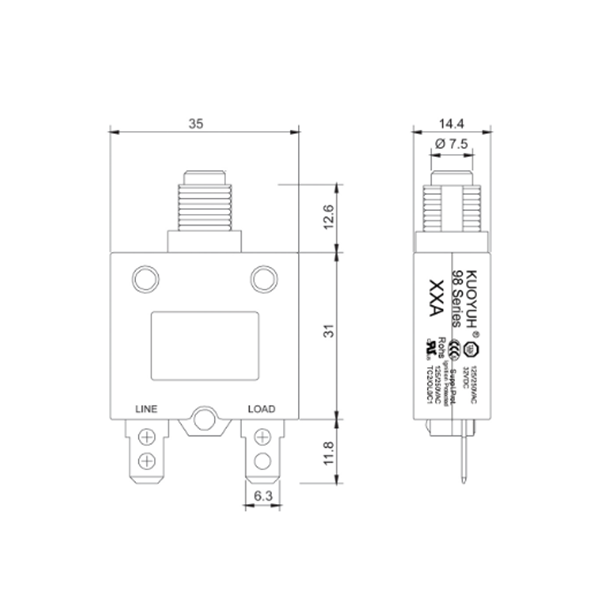 Ο θερμικός διακόπτης υπερέντασης KUO 98-08-A1B14-B0B-B είναι ένας πιστοποιημένος ασφαλειοδιακόπτης υψηλής ποιότητας με χειροκίνητη επαναφορά, σχεδιασμένος για αξιόπιστη προστασία ηλεκτρικών κυκλωμάτων από υπερεντάσεις. Λειτουργεί με βάση τη θερμική παραμόρφωση διμεταλλικού στοιχείου, διακόπτοντας το κύκλωμα όταν το ρεύμα υπερβεί την ονομαστική τιμή.