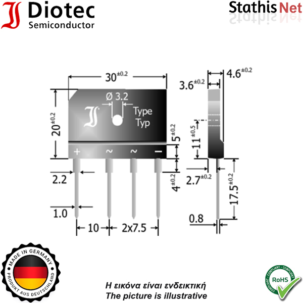 Γέφυρα ανόρθωσης 7A 80V πλακέ B40C7000A Diotec Semiconductor