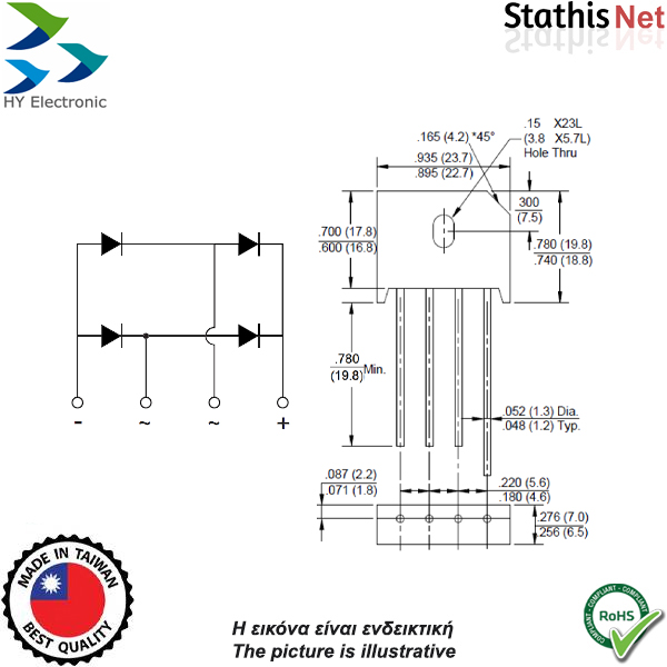 Γέφυρα ανόρθωσης 8A 1000V πλακέ KBU810G HY Electronic