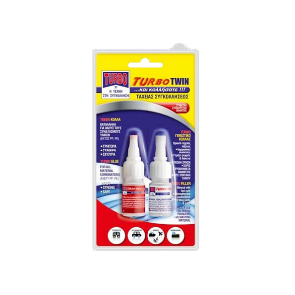 Το Turbo Twin είναι ένα ολοκληρωμένο σύστημα ταχείας συγκόλλησης και επισκευής που συνδυάζει δύο υλικά σε μία συσκευασία: την ισχυρή Turbo-Κόλλα και το ειδικό ορυκτό Turbo-Γεμιστικό ταχείας πήξης.