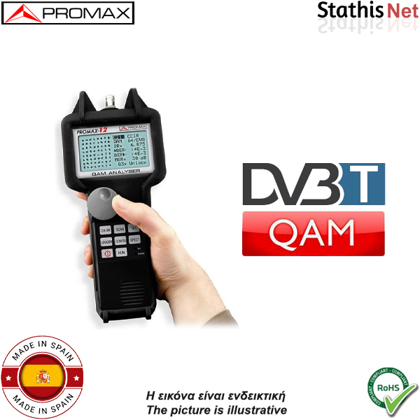 Το PROMAX-12 είναι ένας πολυλειτουργικός ψηφιακός αναλυτής καλωδίων, ιδανικός για την εγκατάσταση και συντήρηση αναλογικών και ψηφιακών συστημάτων λήψης/διανομής τηλεοπτικού σήματος που λειτουργούν στην περιοχή από 5 έως 1005 MHz: ραδιόφωνο FM, συστήματα κοινοτικής τηλεόρασης (MATV), καλωδιακή τηλεόραση (CATV) και ασύρματη καλωδιακή τηλεόραση (MMDS) συμπεριλαμβανομένης της υποζώνης (διαδρομή επιστροφής).