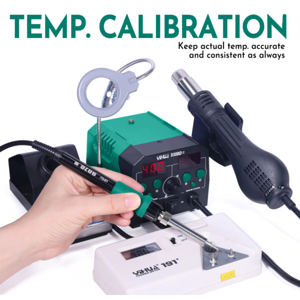 Ο YH-938BD-II της YiHua είναι ένας επαγγελματικός αντιστατικός σταθμός 2 σε 1, που συνδυάζει κολλητήρι και θερμό αέρα, προσφέροντας υψηλή ακρίβεια, σταθερότητα και άνεση εργασίας. Διαθέτει ενσωματωμένο LED φωτιστικό με μεγεθυντικό φακό, καθιστώντας τον ιδανικό για απαιτητικές εργασίες σε ηλεκτρονικά κυκλώματα και SMD εξαρτήματα.