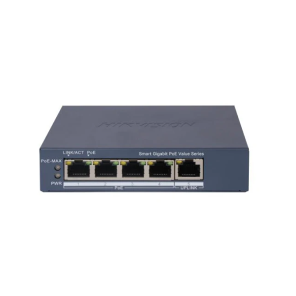 Το Hikvision DS-3E1505P-EI/M είναι ένα οικονομικό, "έξυπνο" (Layer 2 Smart Managed) Gigabit Ethernet Switch 5 θυρών, σχεδιασμένο για μικρές επαγγελματικές εγκαταστάσεις. Διαθέτει 4 θύρες PoE+ για την άμεση τροφοδοσία καμερών ή άλλων δικτυακών συσκευών και 1 θύρα Gigabit Uplink (LAN) για τη σύνδεση με το καταγραφικό ή το κεντρικό δίκτυο.