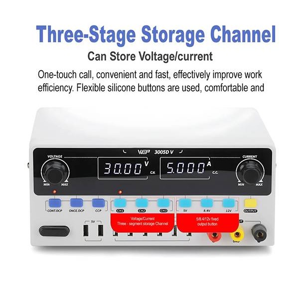 Διαθέτει 3 κανάλια μνήμης για γρήγορη αποθήκευση και ανάκληση ρυθμίσεων, καθώς και κουμπιά άμεσης επιλογής σταθερών τάσεων (5V, 8.4V, 12V). Ξεχωρίζει για τις πολλαπλές δυνατότητες σύνδεσης, προσφέροντας 8 θύρες USB: 2 θύρες σταθερής τάσης 5V και 6 θύρες ρυθμιζόμενης τάσης (παράλληλες με την κύρια έξοδο 0-30V), επιτρέποντας την ταυτόχρονη τροφοδοσία πολλών συσκευών (με προσοχή στην τάση). Προσφέρει προηγμένη προστασία με λειτουργίες OCP (Over Current Protection) που μπορούν να ρυθμιστούν είτε για περιορισμό ρεύματος (CC) είτε για διακοπή εξόδου (Stop) σε περίπτωση υπερφόρτωσης.